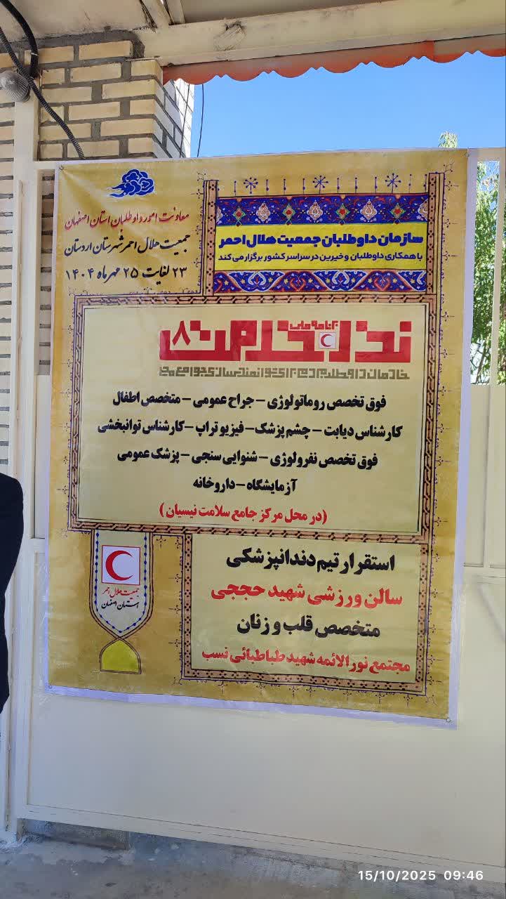 🔹با افتخار و حضور گرم آقای دکتر محمد علی گلی، مدیر محترم شبکه بهداشت و اردستان،آقای دکتر محمود رضا زاهد نژاد،رئیس مرکز بهداشت،جناب آقای حیدری،فرماندار محترم شهرستان،فرمانده سپاه اردستان،و پرسنل محترم جمعیت هلال احمر اردستان،برنامه گسترده و ارزشمند خدمترسانی به هموطنان عزیز در روستای نیسیان برگزار گردید.